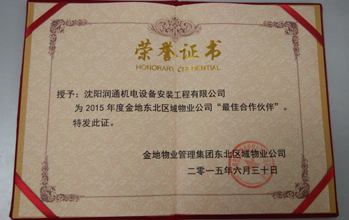 2015年6月30日,金地物業(yè)管理集團(tuán)東北區(qū)域物業(yè)公司授予沈陽(yáng)潤(rùn)通機(jī)電設(shè)備安裝工程有限公司為2015年度金地東北區(qū)域物業(yè)公司“最佳合作伙伴”榮譽(yù)證書(shū),自2013年11月與金地名京一期、二期簽訂電梯維保合同至今,潤(rùn)通人堅(jiān)持24小時(shí)熱線不間斷,12個(gè)月度維保報(bào)告不松懈,年度電梯故障分析準(zhǔn)確到位,客戶(hù)響應(yīng)及時(shí)、到位等優(yōu)秀品質(zhì),獲得了業(yè)主的好評(píng)。這份榮譽(yù)不僅說(shuō)明了我們的工作得到了客戶(hù)的認(rèn)可,更印證了我們的努力是值得的,同時(shí)更是鞭策我們不斷提高,深挖潛力的動(dòng)力,讓我們不停的努力和改進(jìn)去完善服務(wù)內(nèi)容和服務(wù)品質(zhì),做專(zhuān)屬于潤(rùn)通的優(yōu)秀維保服務(wù)。
